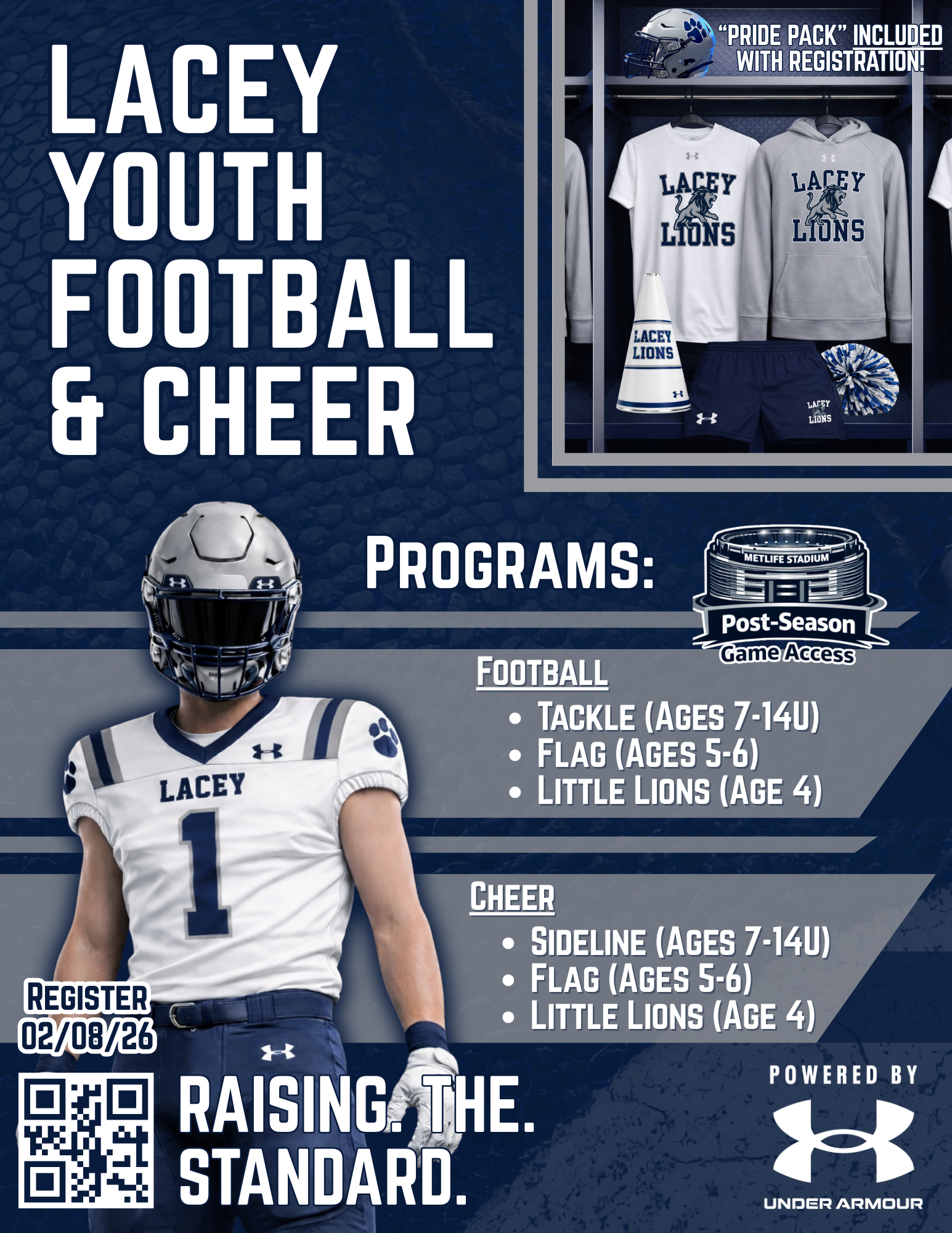 Lacey Youth Football & Cheer (LYFC) is the premier youth football and cheer organization serving the Lacey Township community. For over 50 years, our league has been a cornerstone of local athletics - developing confident athletes, strong teammates, and resilient young leaders.